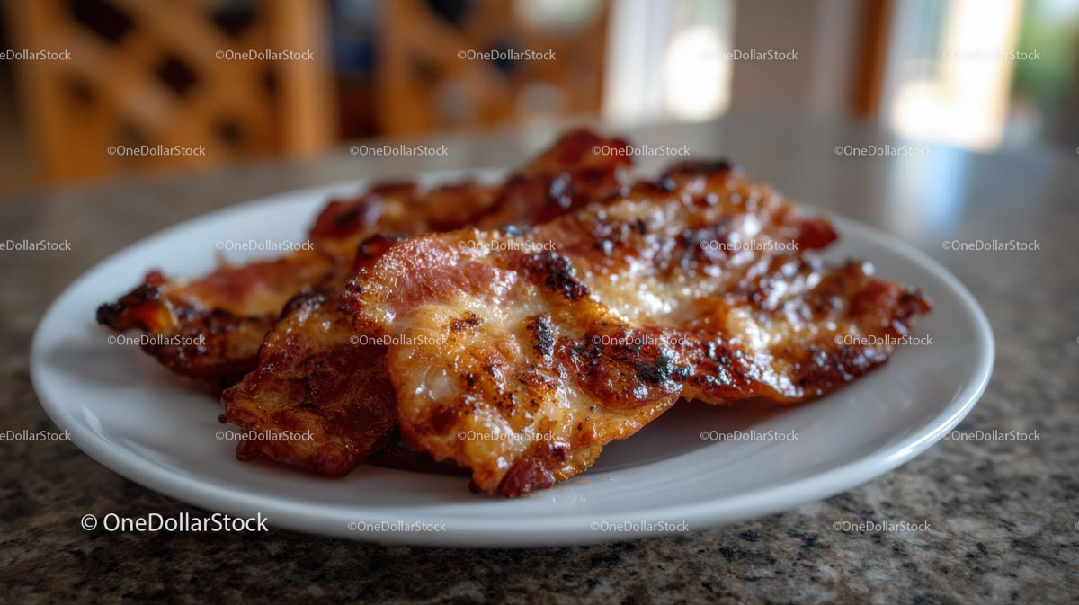 Crispy Bacon on a White Plate in a Sunlit Kitchen