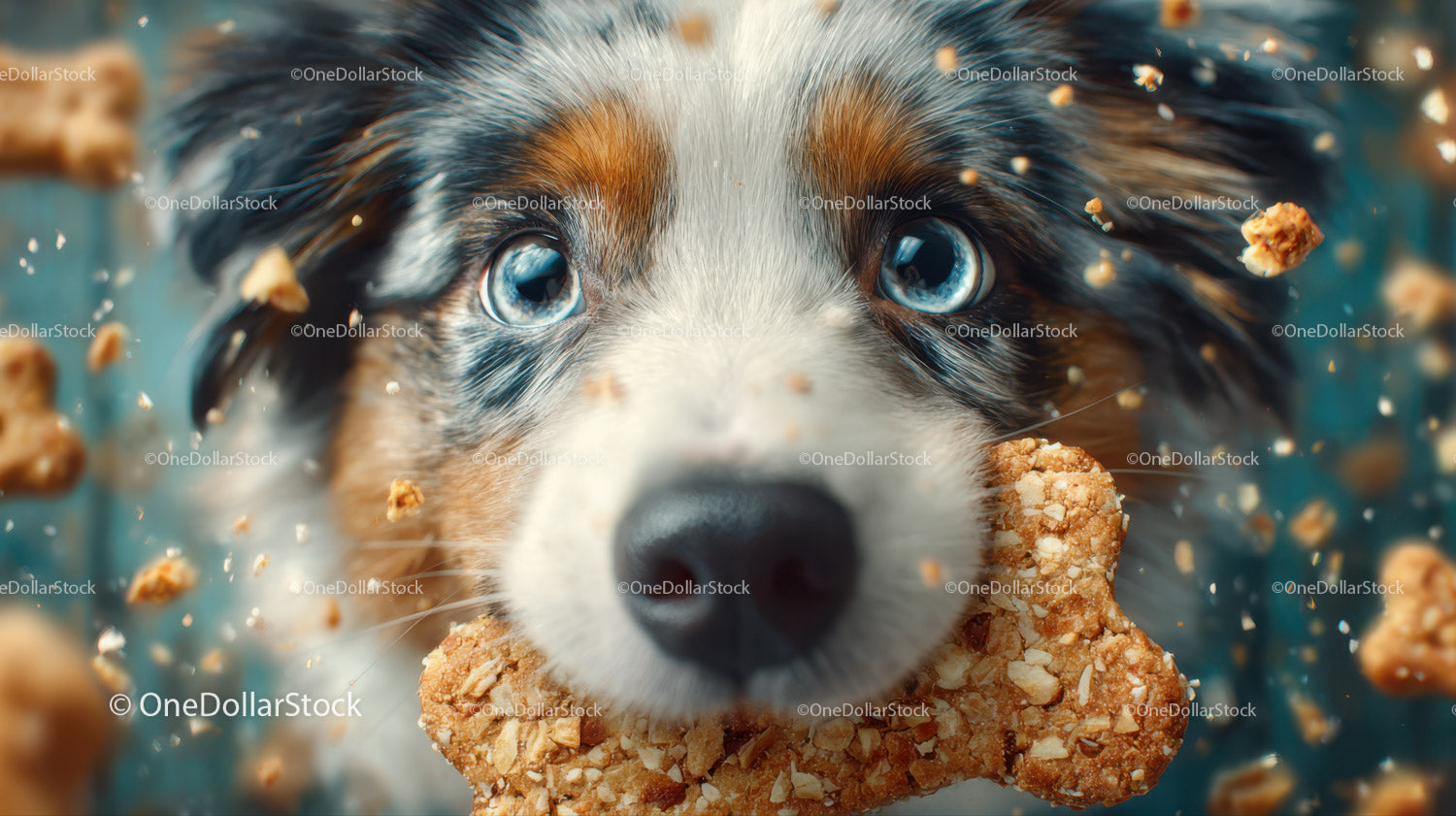 Cute Australian Shepherd Puppy with Blue Eyes Playing with Biscuit