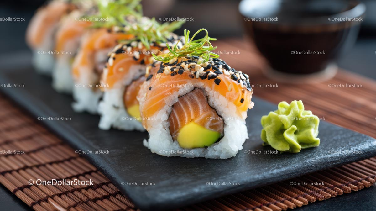 Delicious Salmon Sushi Roll with Avocado and Herbs