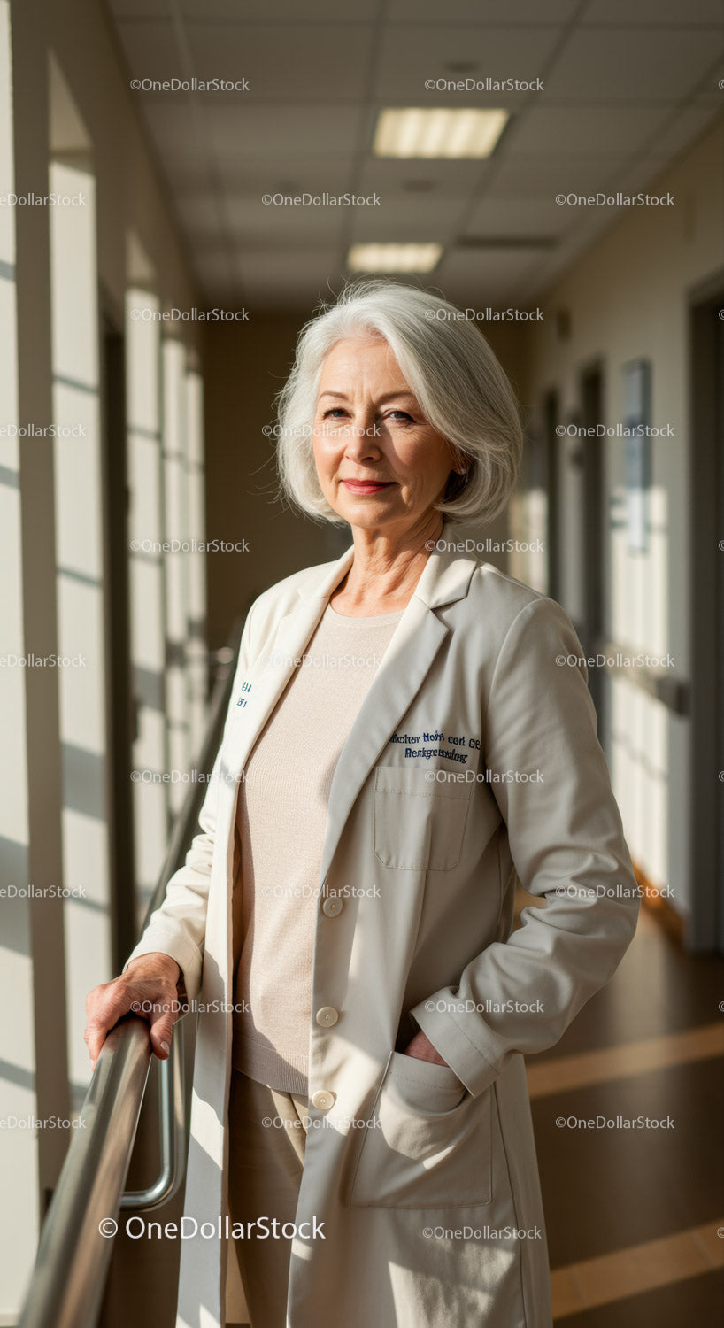 Elegant Senior Woman Doctor in Hospital Corridor with Confident Pose