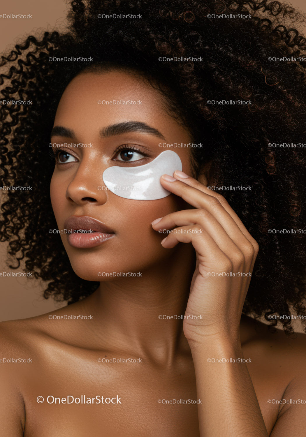 Elegant Woman with Curly Hair Applying Eye Mask for Skincare