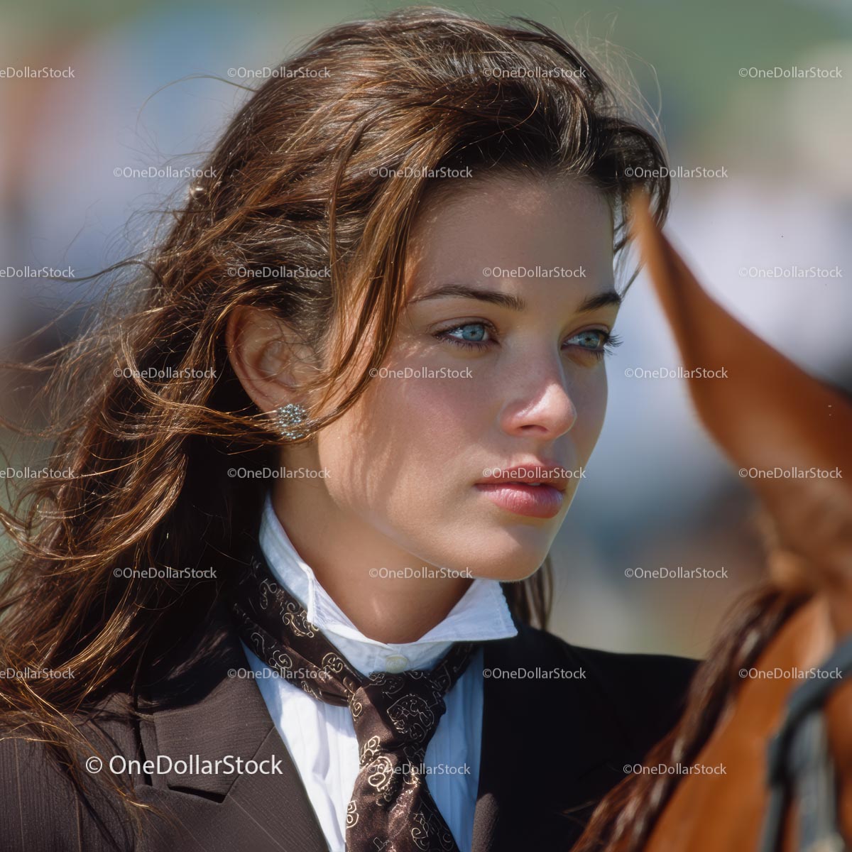 Elegant Young Woman with Brown Hair and Blue Eyes Outdoors