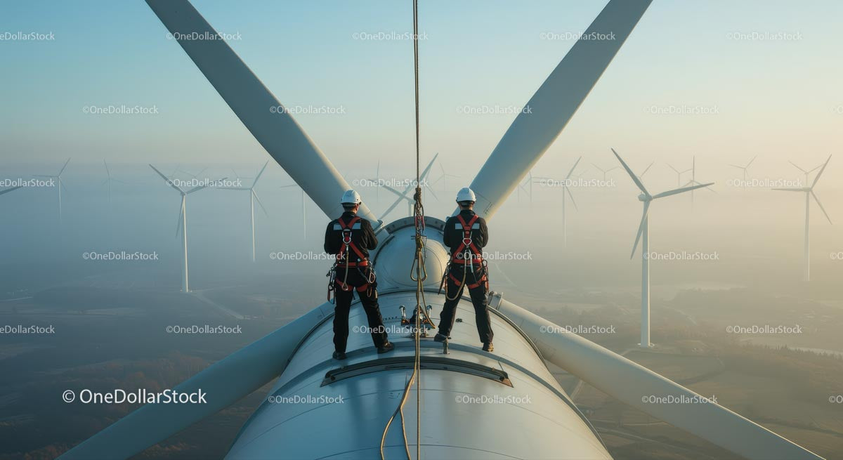 Engineers on Wind Turbine During Dawn Maintenance