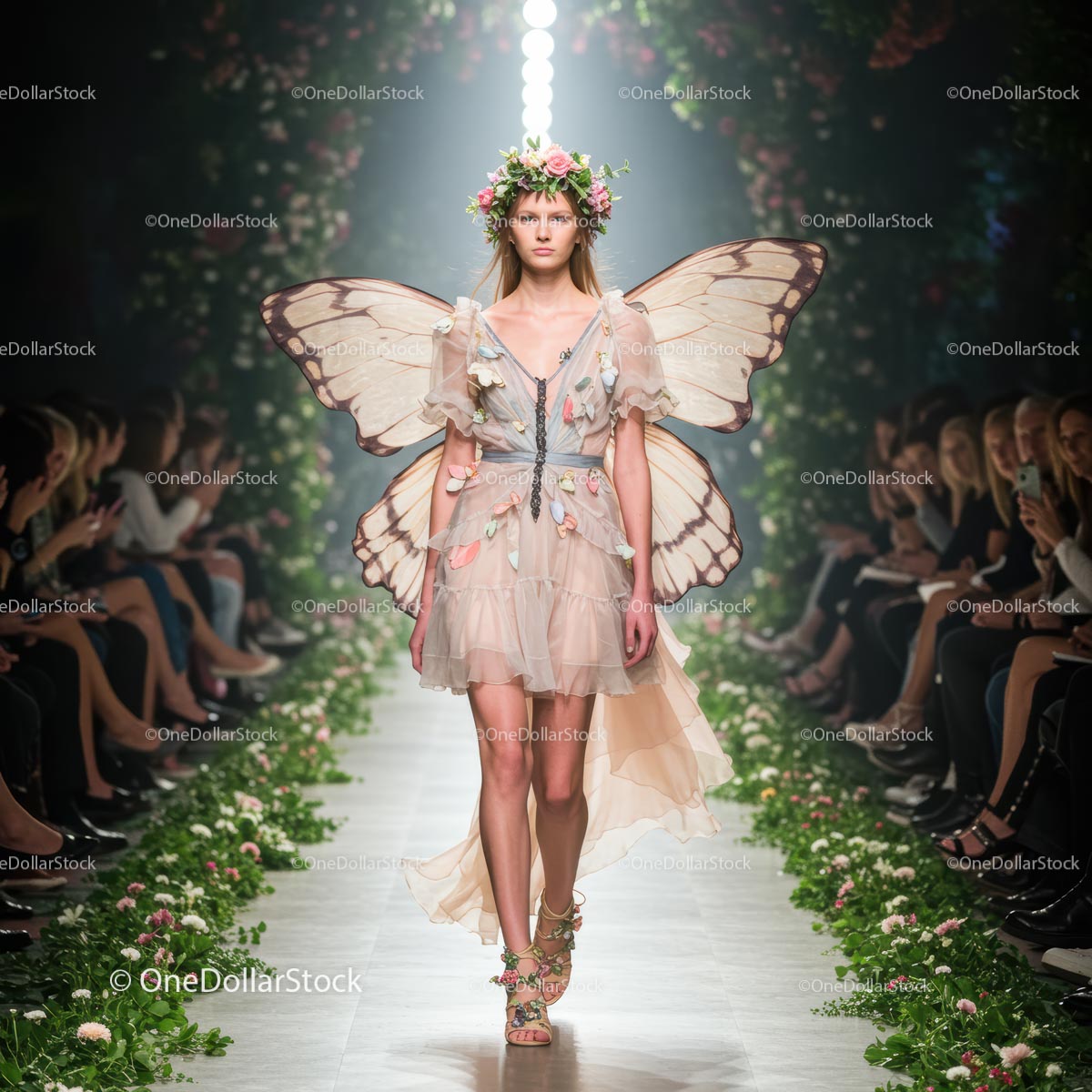 Ethereal Model on Runway in Butterfly-Winged Floral Dress