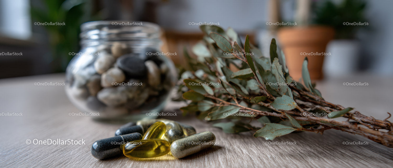 Eucalyptus and Herb Sprig with Assorted Herbal Supplements on Wooden Surface