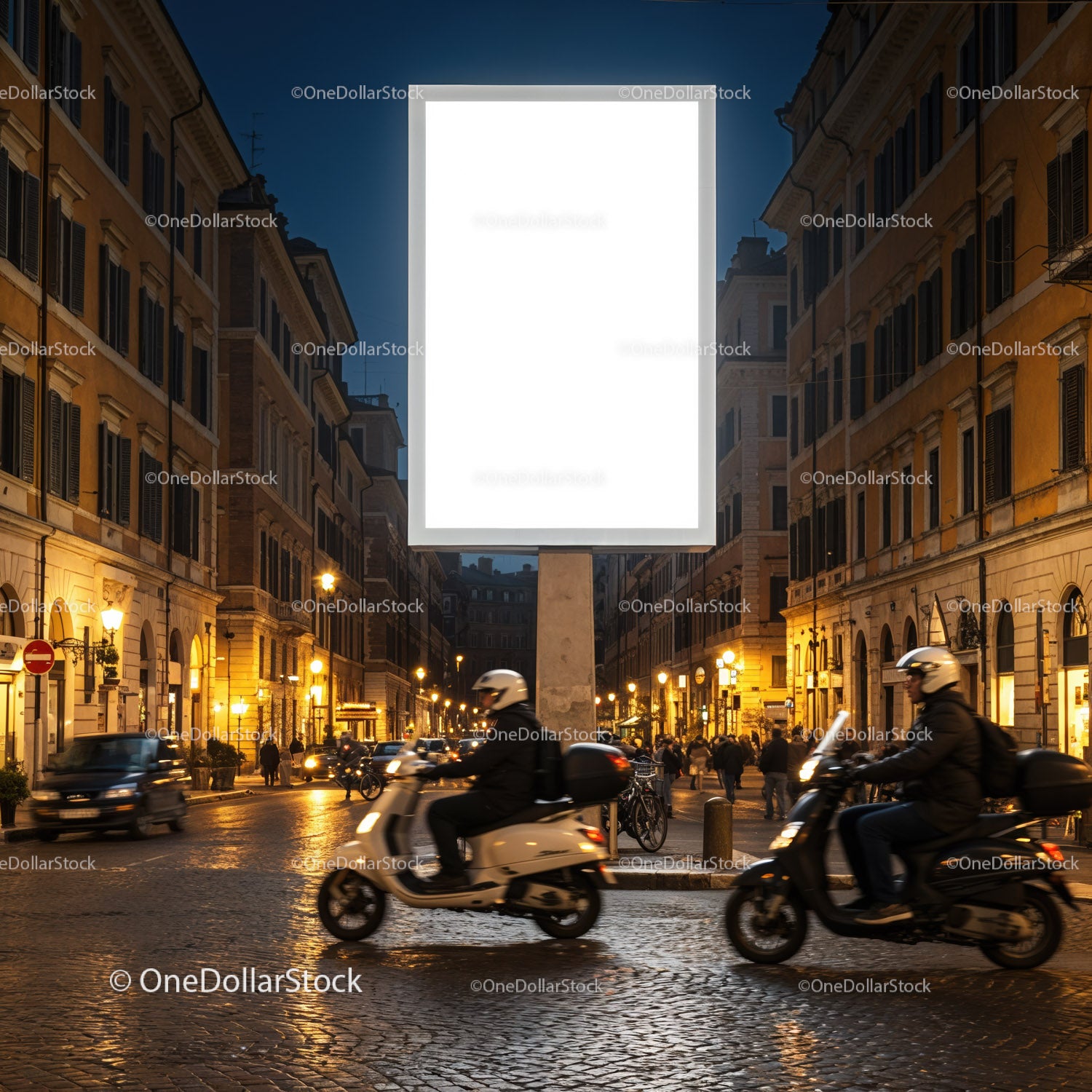 Evening traffic with scooters on historic cobblestone street