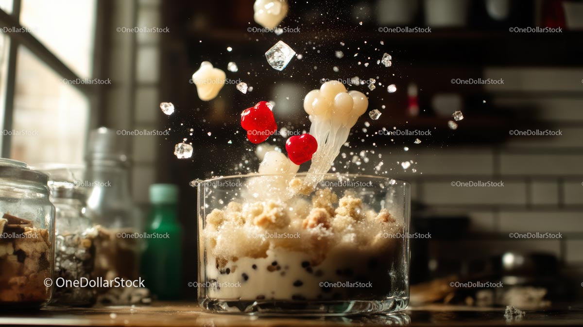 Explosive Dessert with Ice Cream and Cherries in Motion