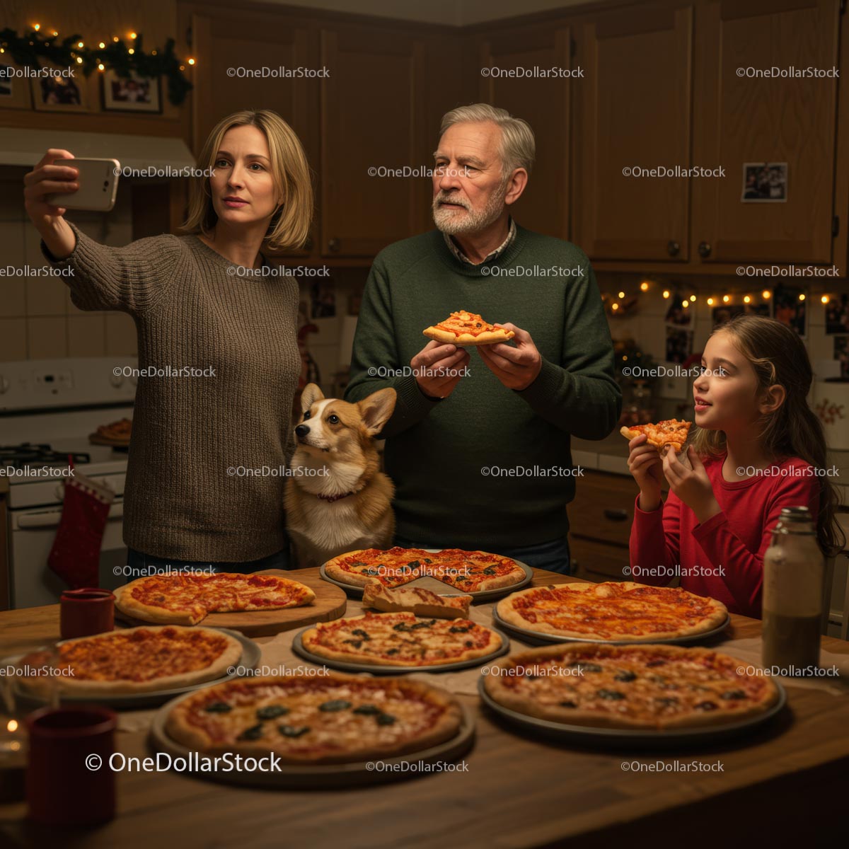 Family Enjoying Homemade Pizza with Corgi in Cozy Kitchen
