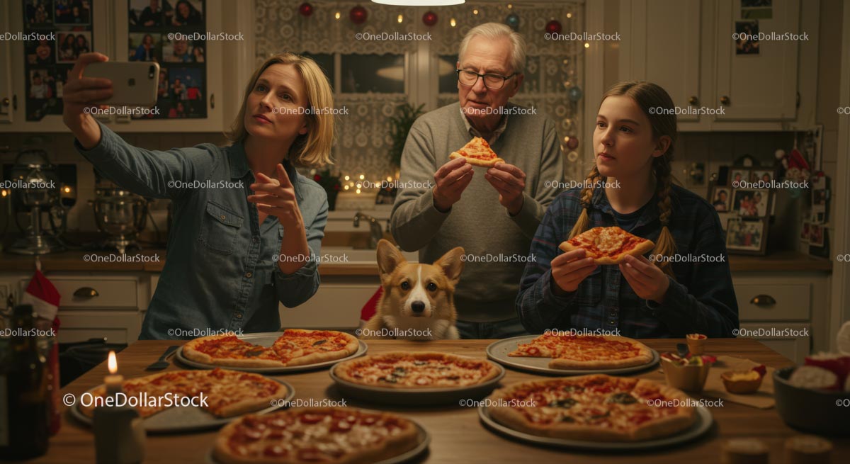 Family Enjoying Homemade Pizza with Corgi in Cozy Kitchen