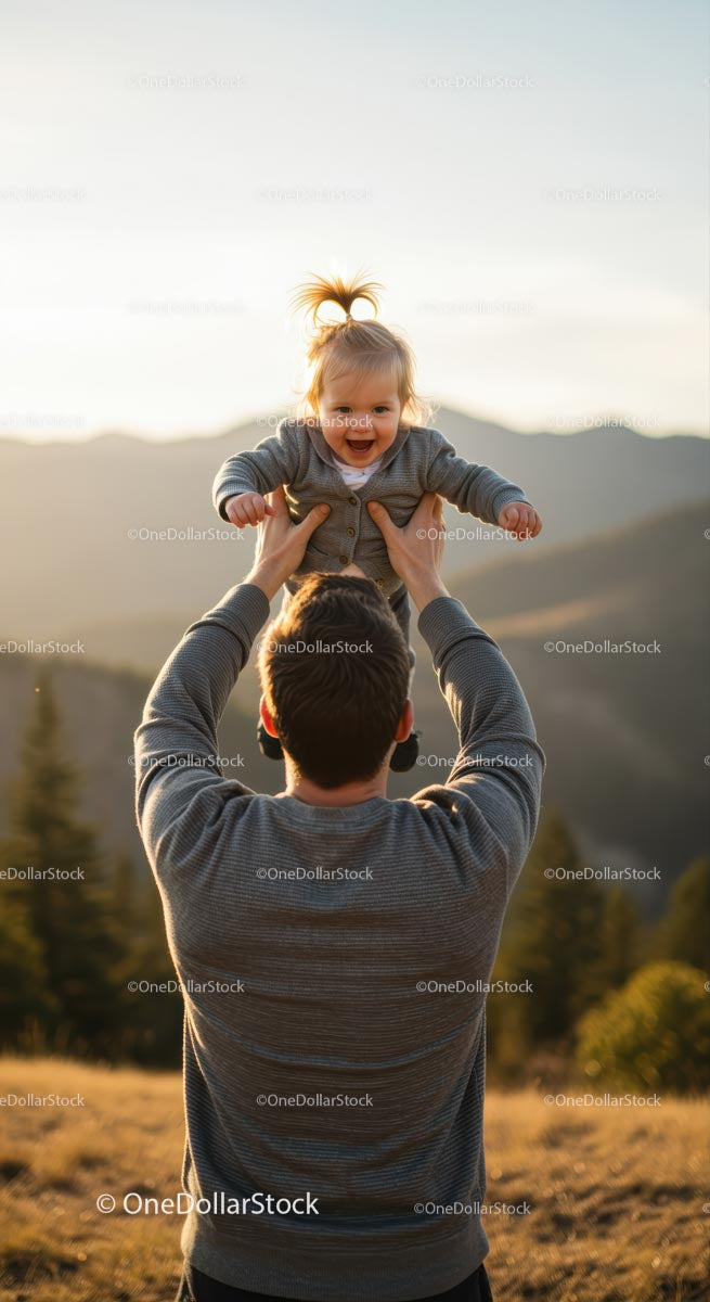 Father Lifting Smiling Toddler Against Mountain Backdrop
