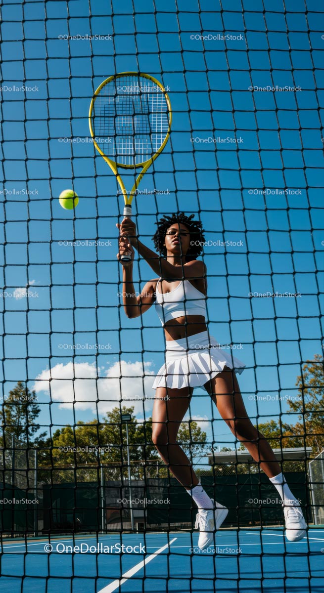 Dynamic female tennis player in motion on a sunny day, showcasing her skills and athleticism on the court. The bright blue sky serves as a vibrant backdrop, while the net creates an exciting division in the frame. Her focused expression and poised stance capture the competitive spirit of the sport, making this image perfect for themes of sports, fitness, and outdoor activities.
