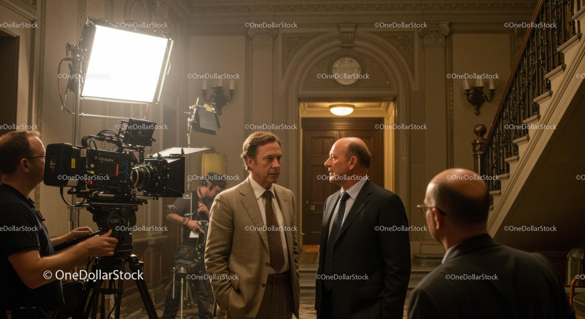 Film Crew on Set with Actors in Classic Interior