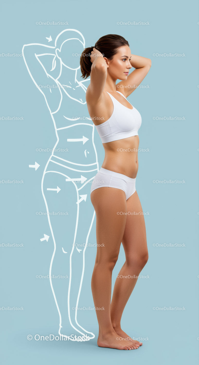 Fit Woman in White Sportswear with Body Diagram Against Blue Background