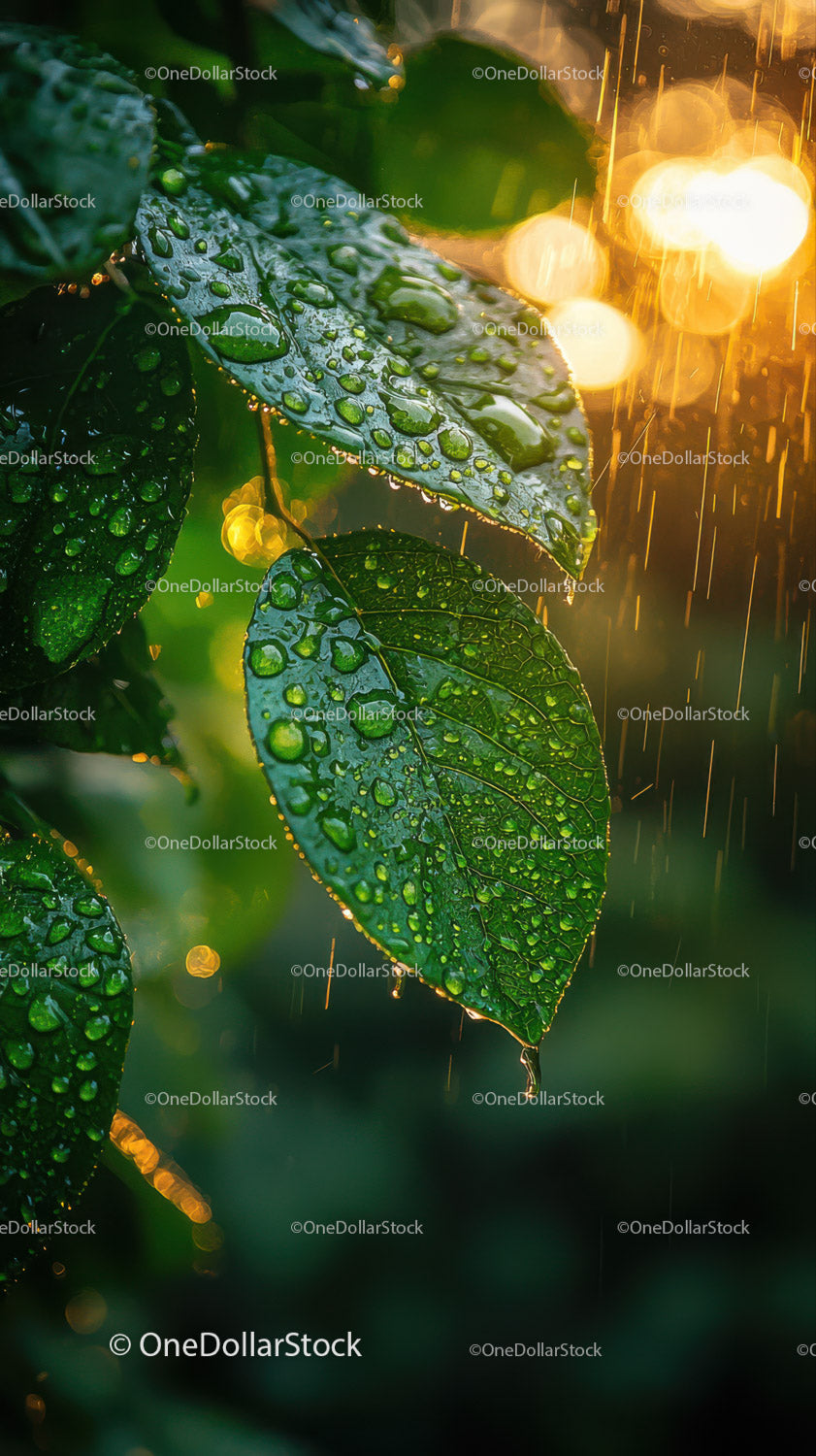 Fresh Green Leaves with Water Droplets and Sunlight in Nature