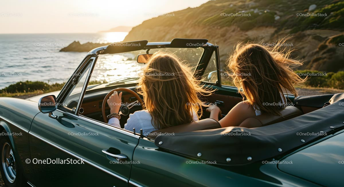 Friends Driving Convertible Along Scenic Coastal Road at Sunset