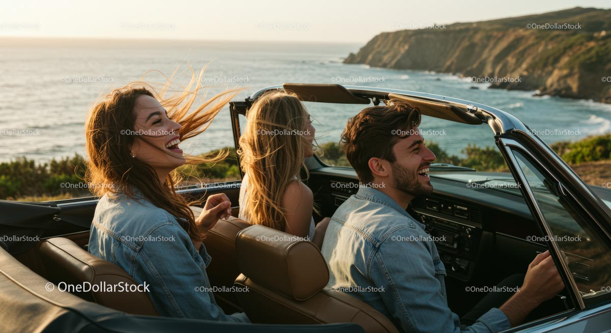Friends Enjoying Coastal Road Trip in Convertible Car