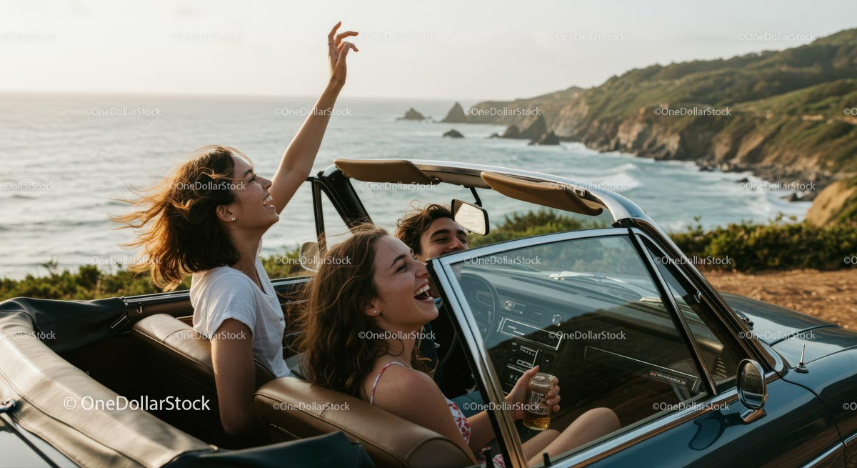 Friends Enjoying Convertible Road Trip by the Ocean