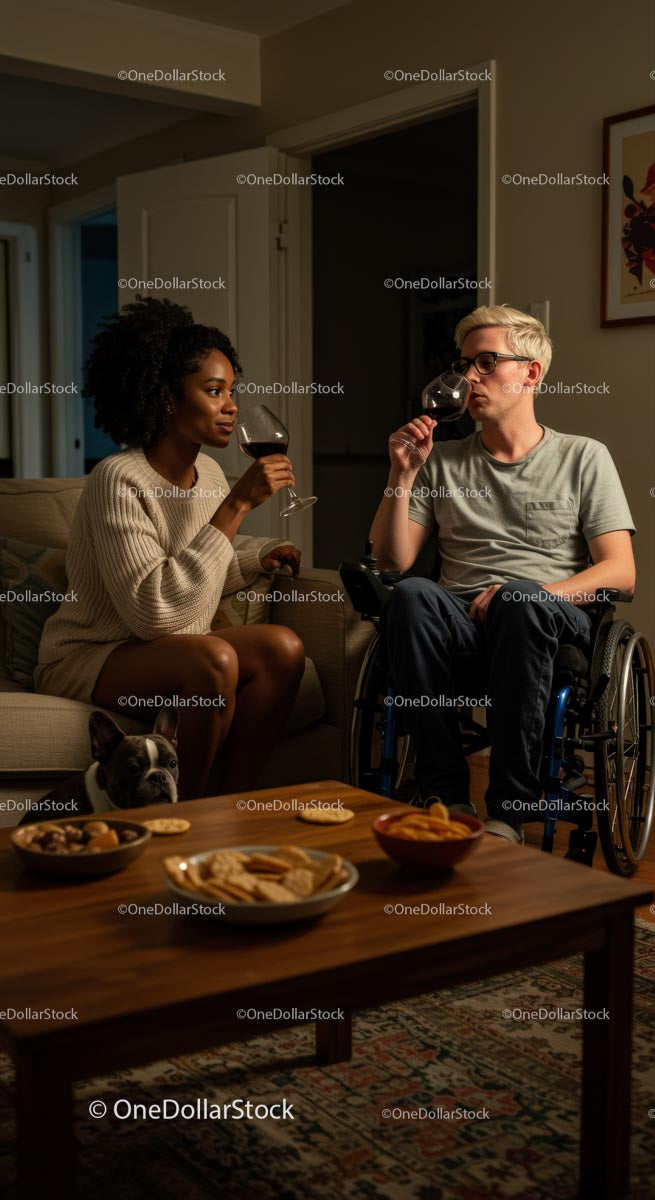 Friends Enjoying Wine and Snacks in Cozy Living Room