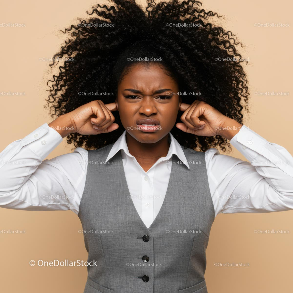 Frustrated Woman Covering Ear with Headphones in Indoor Setting