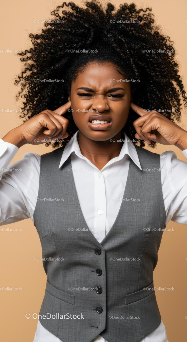 Frustrated Woman Covering Ears Expressing Displeasure in Studio