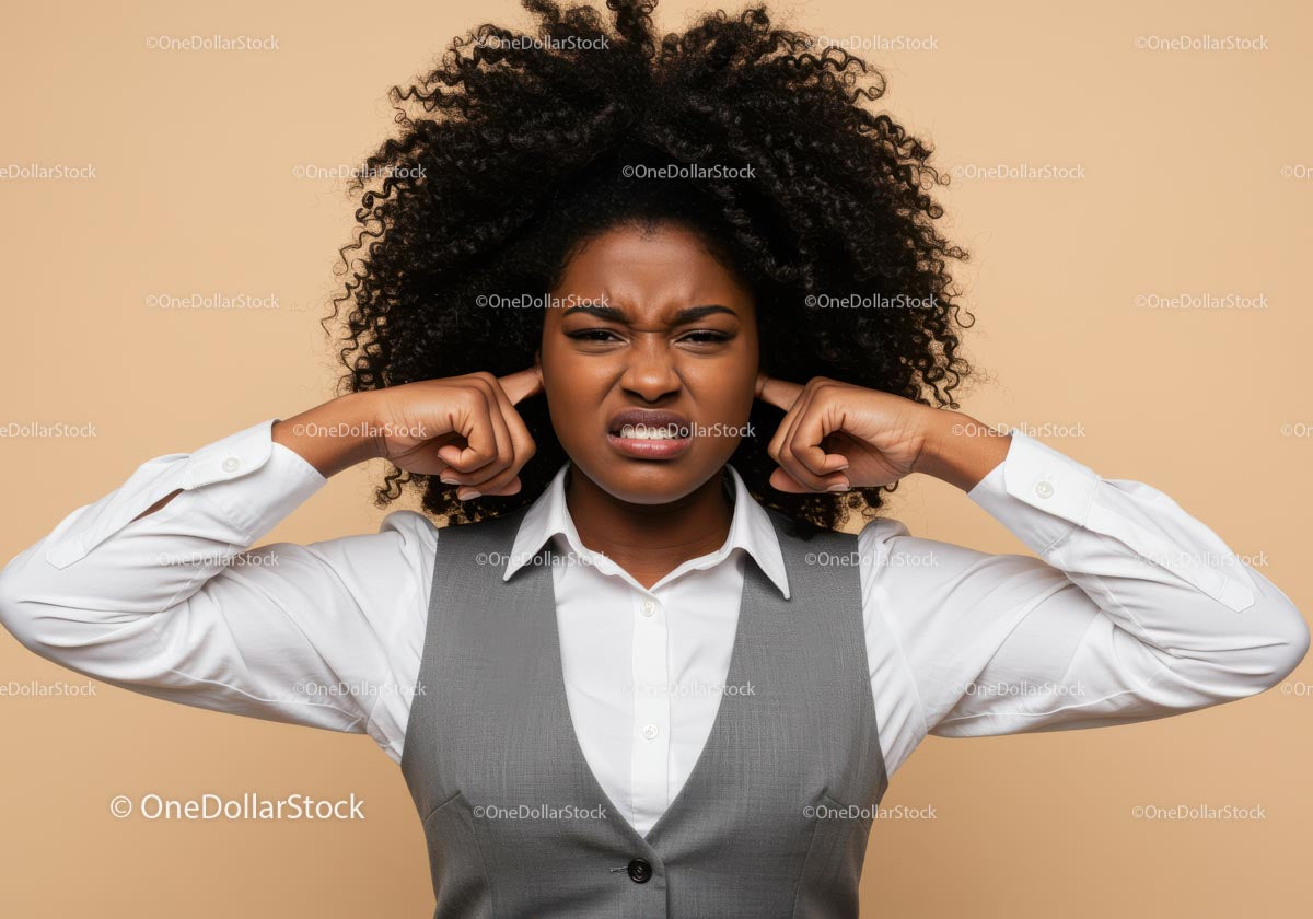 Frustrated Woman Covers Ears Against Noise in Business Attire (60 Images)