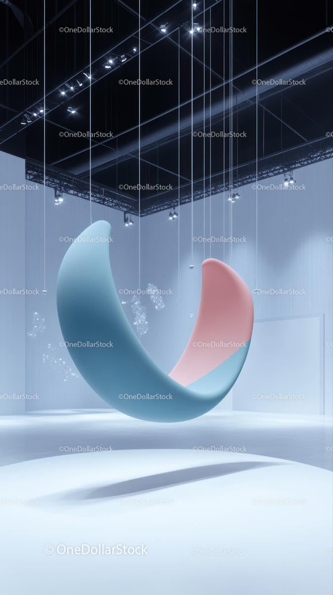 Futuristic Suspended Crescent Sculpture in Contemporary Art Space