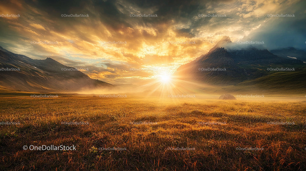 Golden Sunrise Over Misty Mountain Landscape
