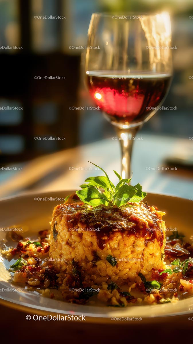 Gourmet Rice Dish with Basil and Red Wine in Evening Light
