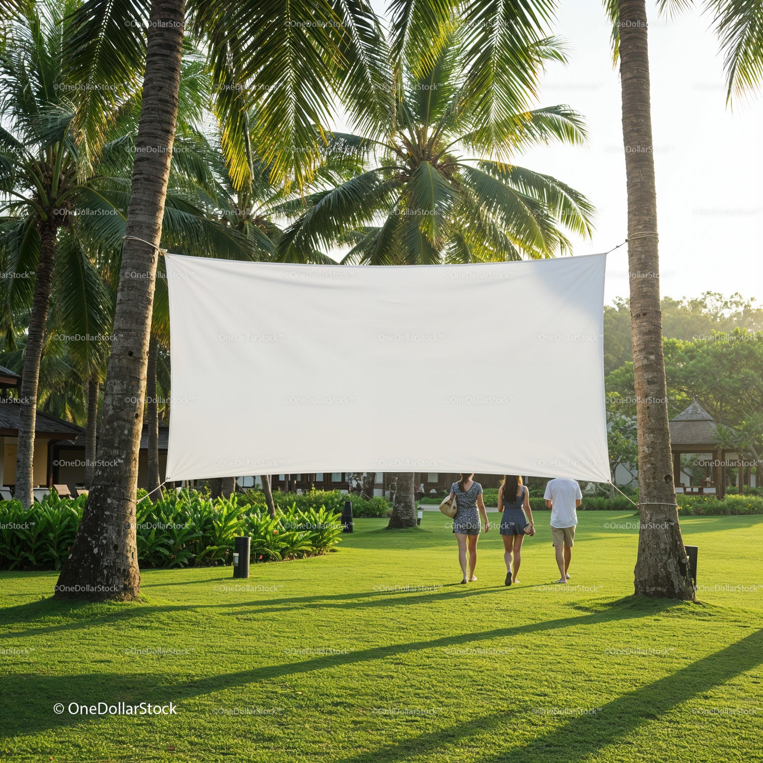 Group walking under blank white screen in tropical park