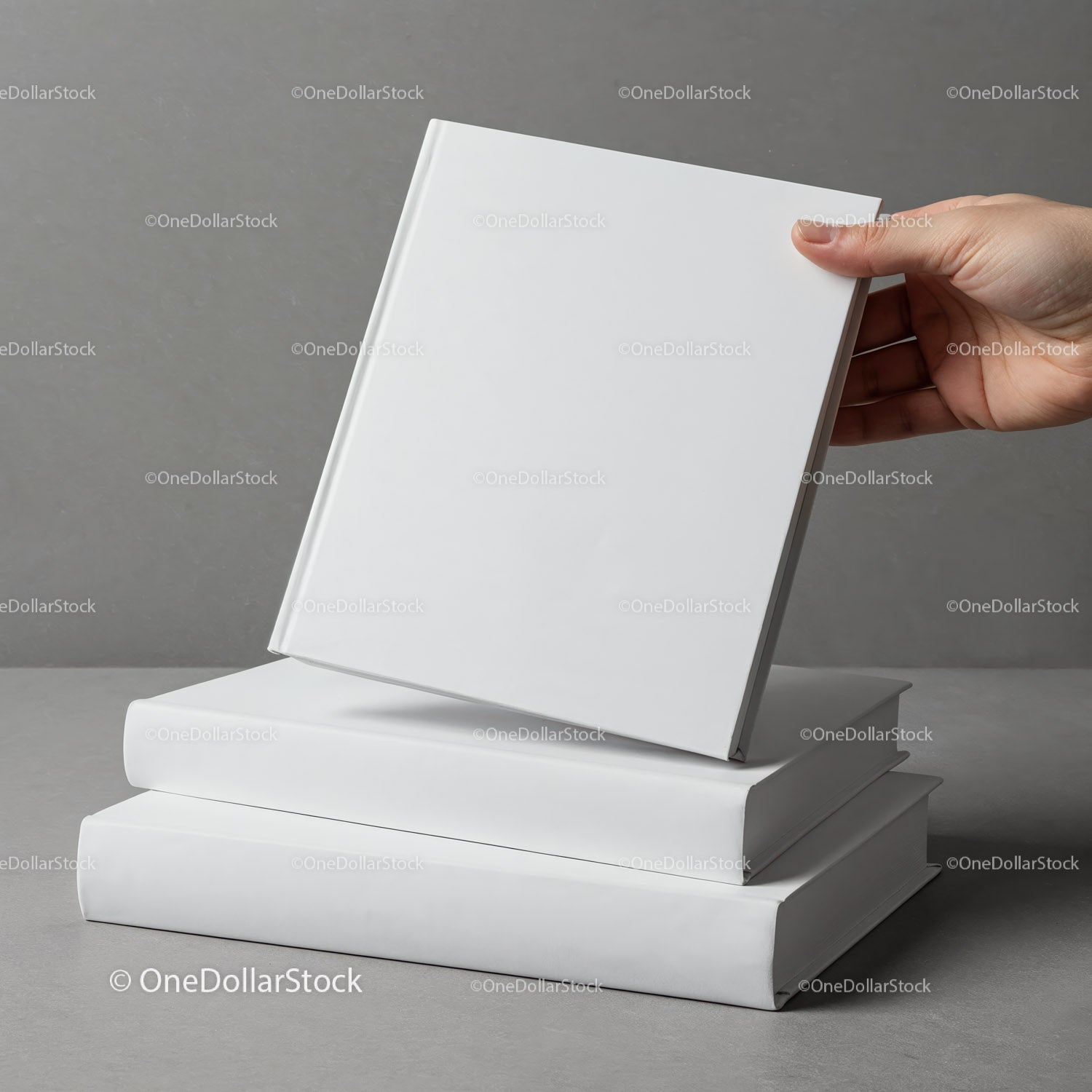 Hand holding blank book over stacked white books