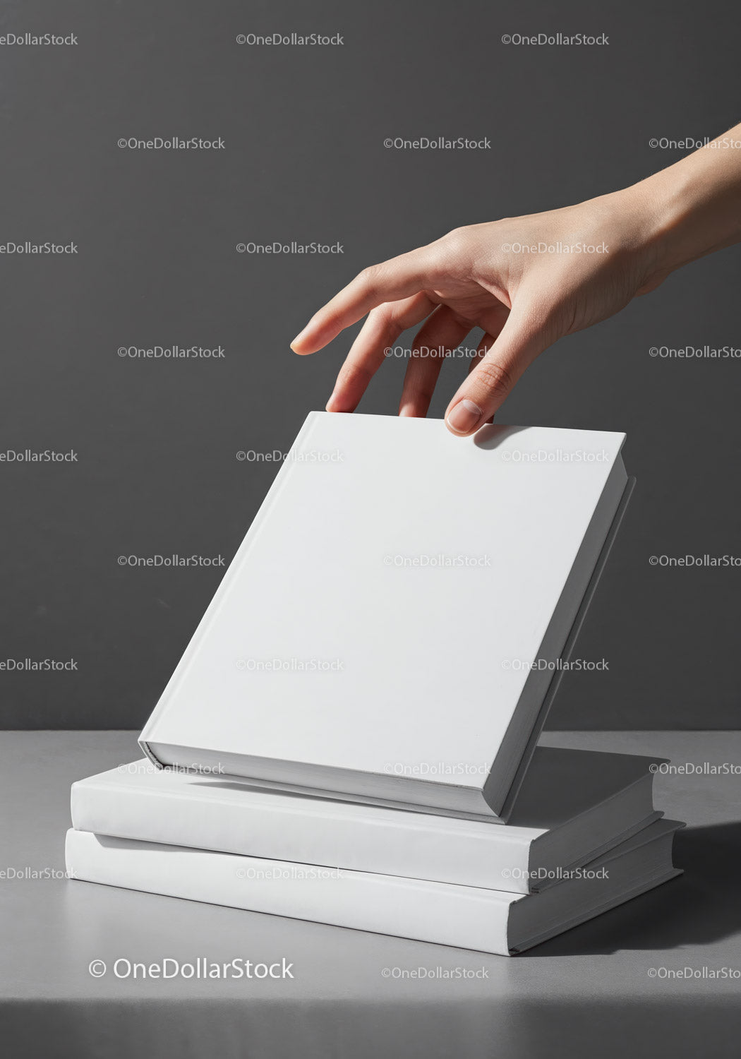 Hand picking a white book from stacked hardcover books