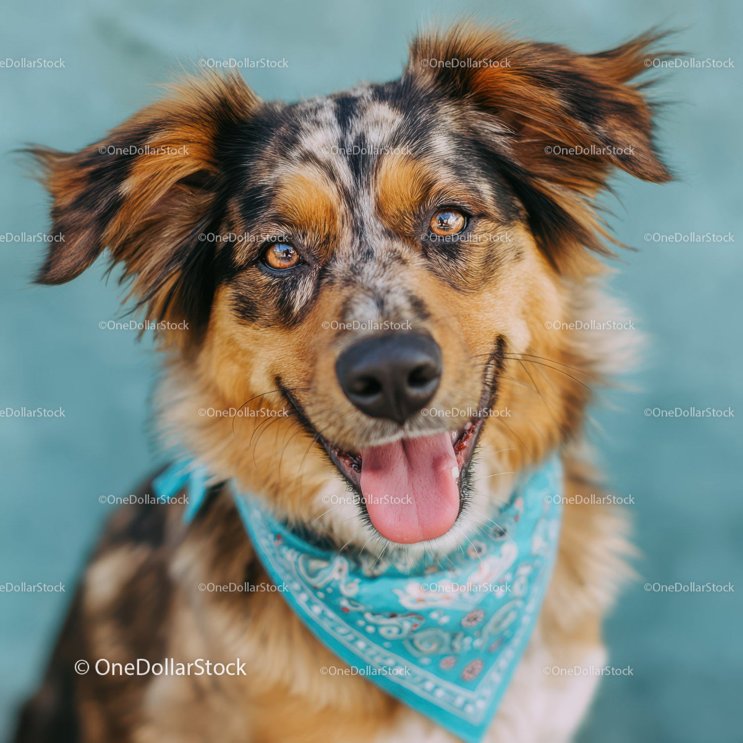 Happy Australian Shepherd Puppy with Blue Bandana Close-Up Portrait