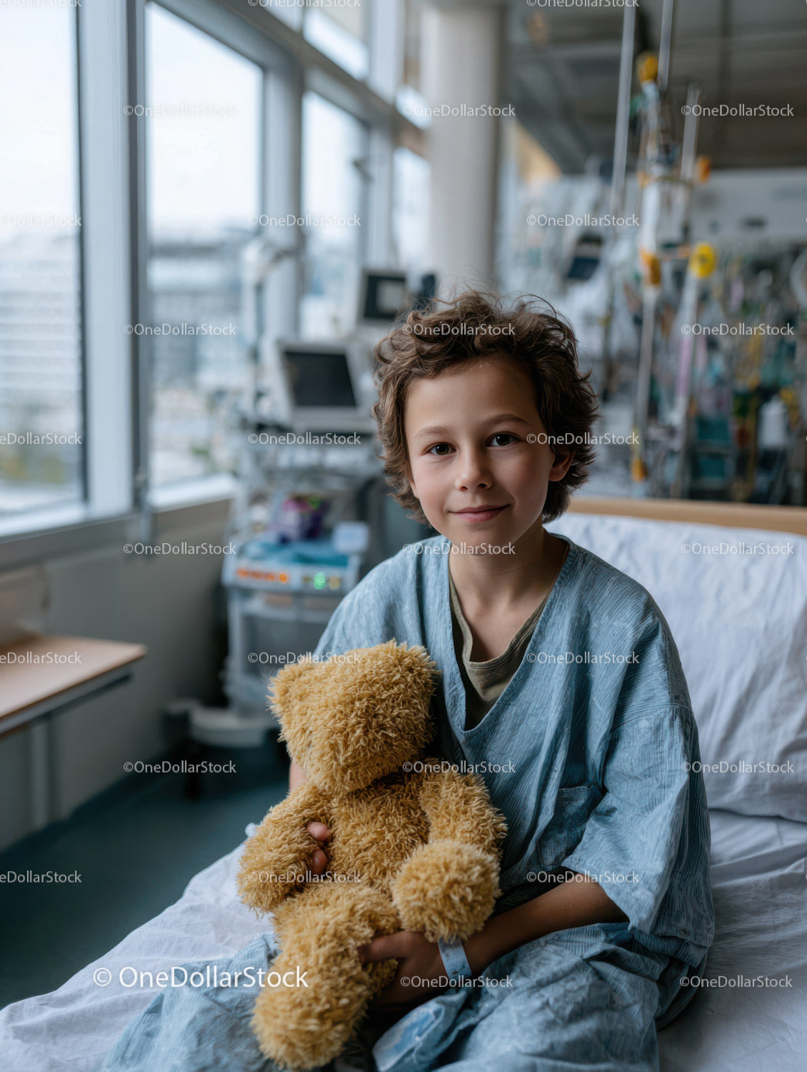 Happy Young Boy in Hospital Room Holding Teddy Bear