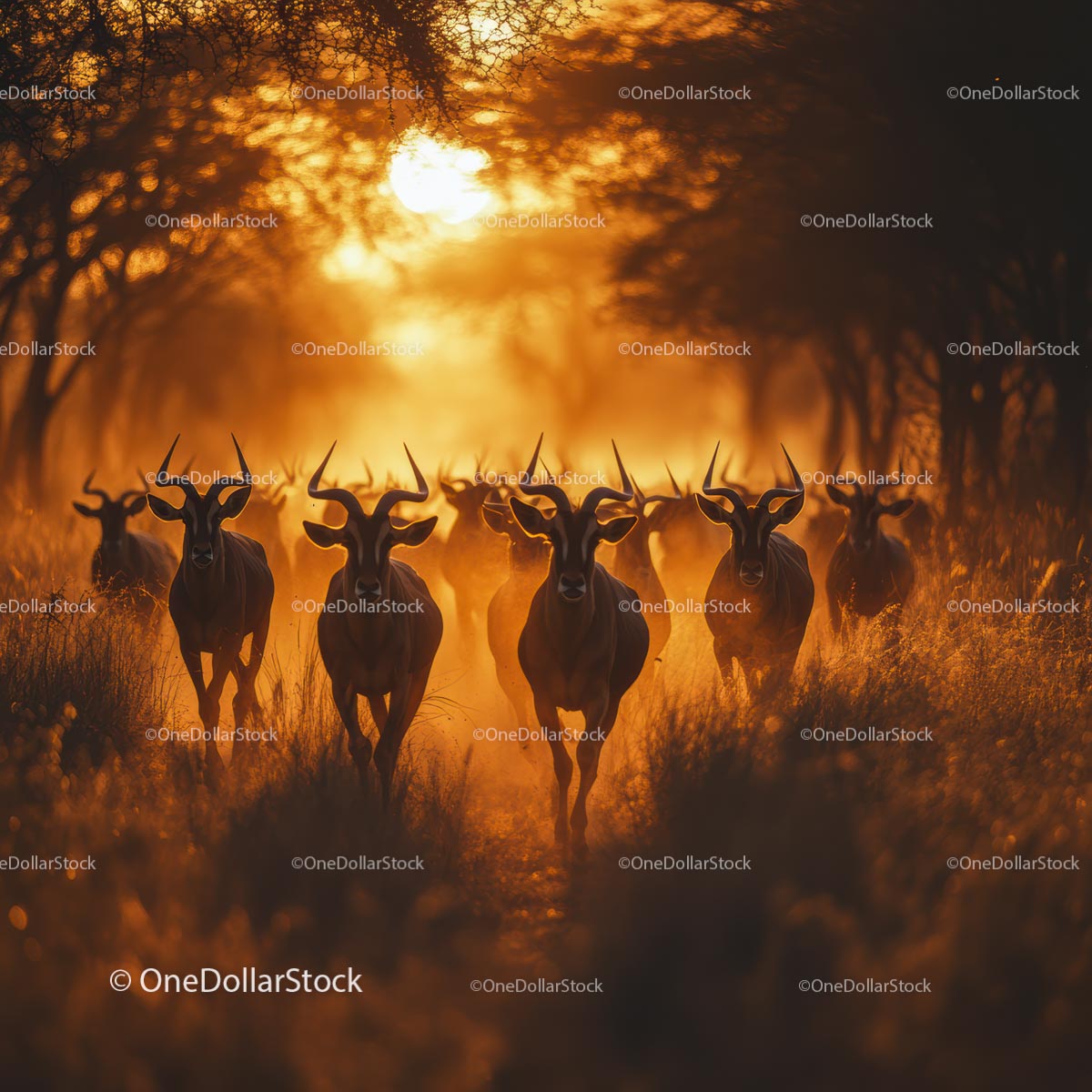 Herd of Antelopes Running Through Golden Savannah at Sunset