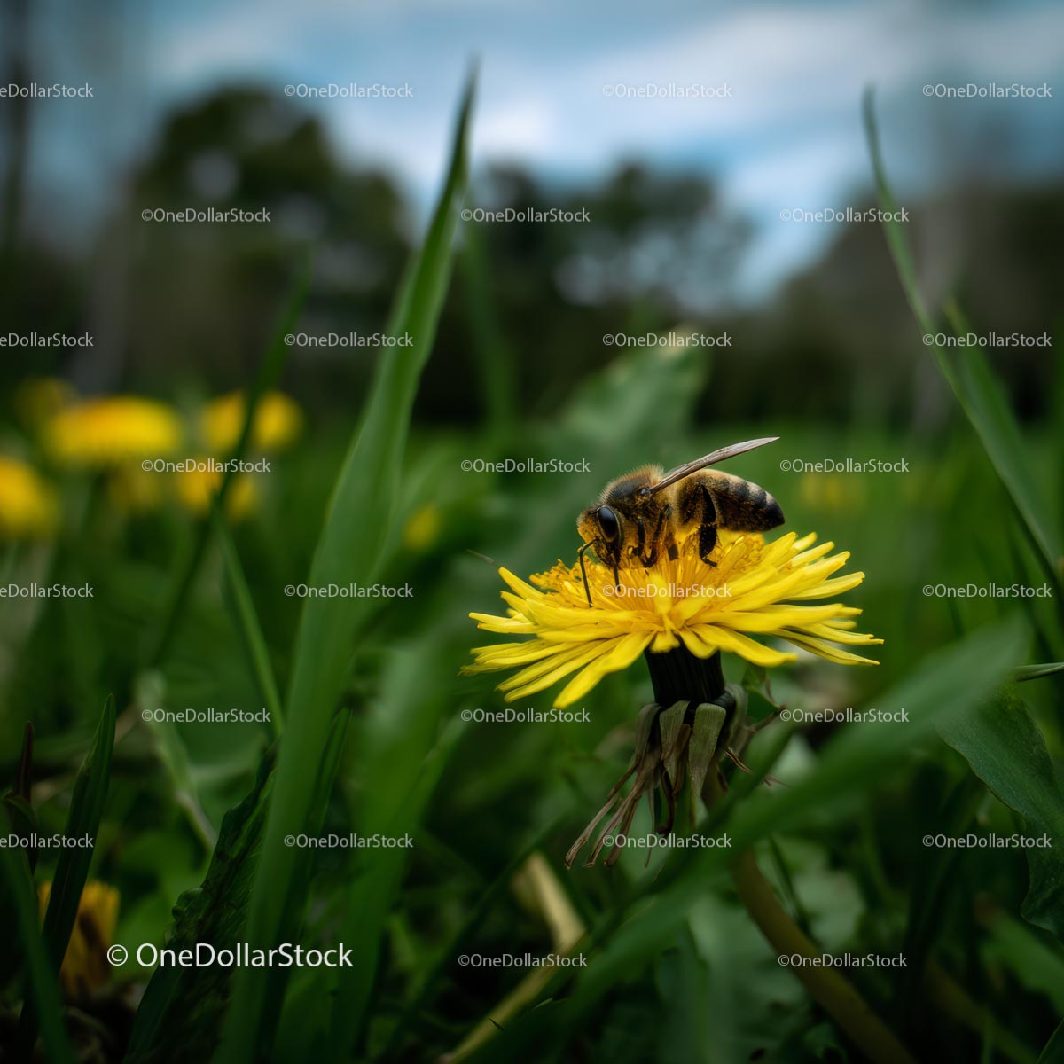 Honeybee Pollinating Dandelion in Spring Meadow