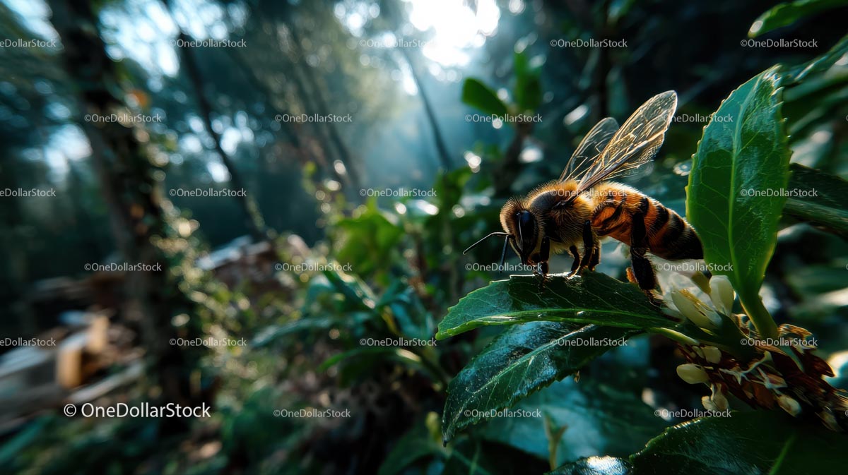 Honeybee Pollinating on Green Leaf in Sunlit Garden