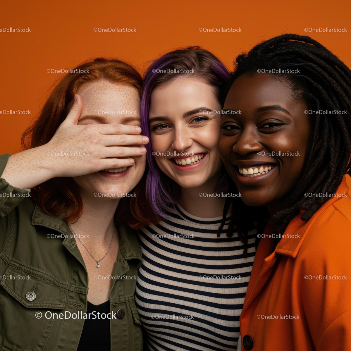 Joyful Friends in Colorful Outfits Against Orange Backdrop