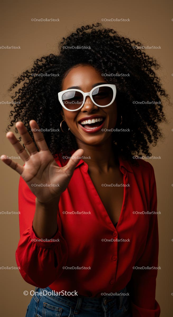 Joyful Woman in Red Blouse and Sunglasses Smiling Brightly