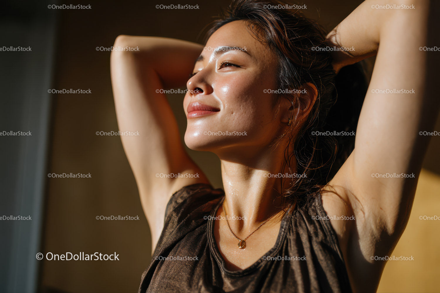 Joyful Woman Relaxing in Sunlight with Closed Eyes and Peaceful Expression
