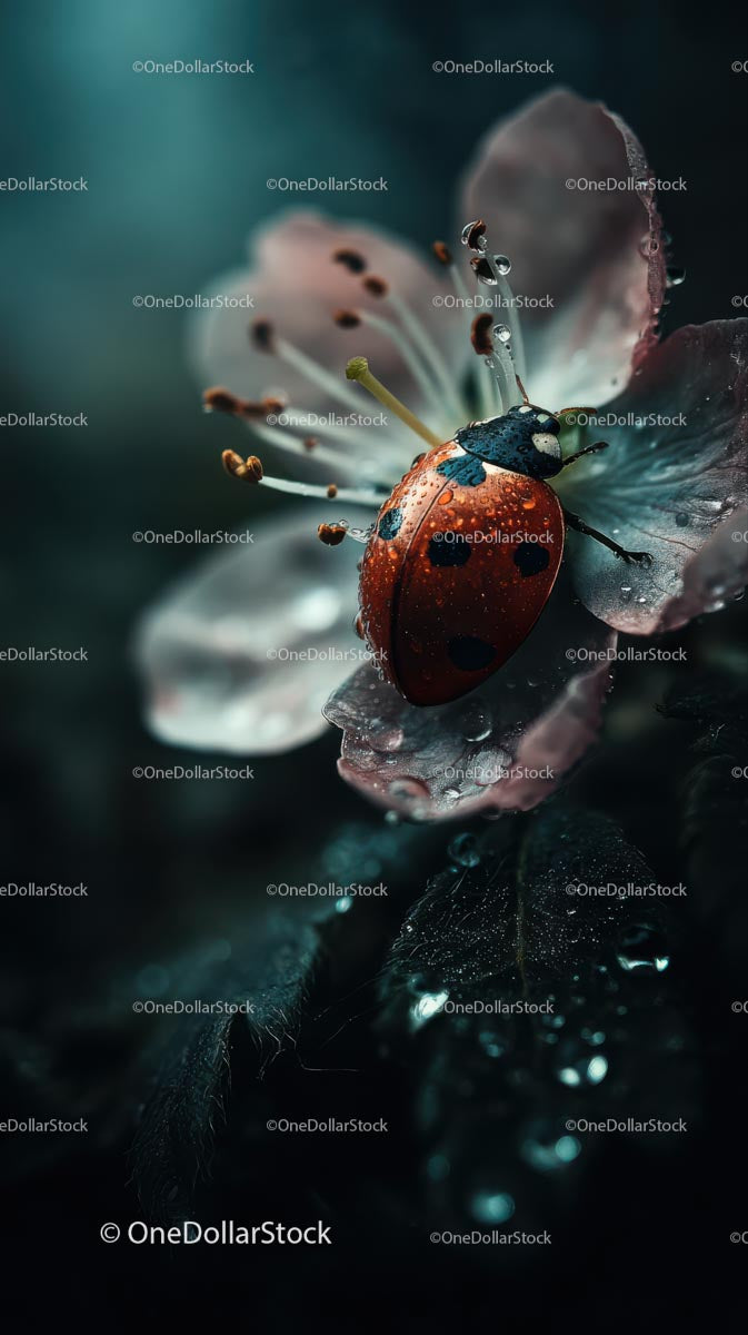 Ladybug on Dew-Kissed Flower in Lush Garden
