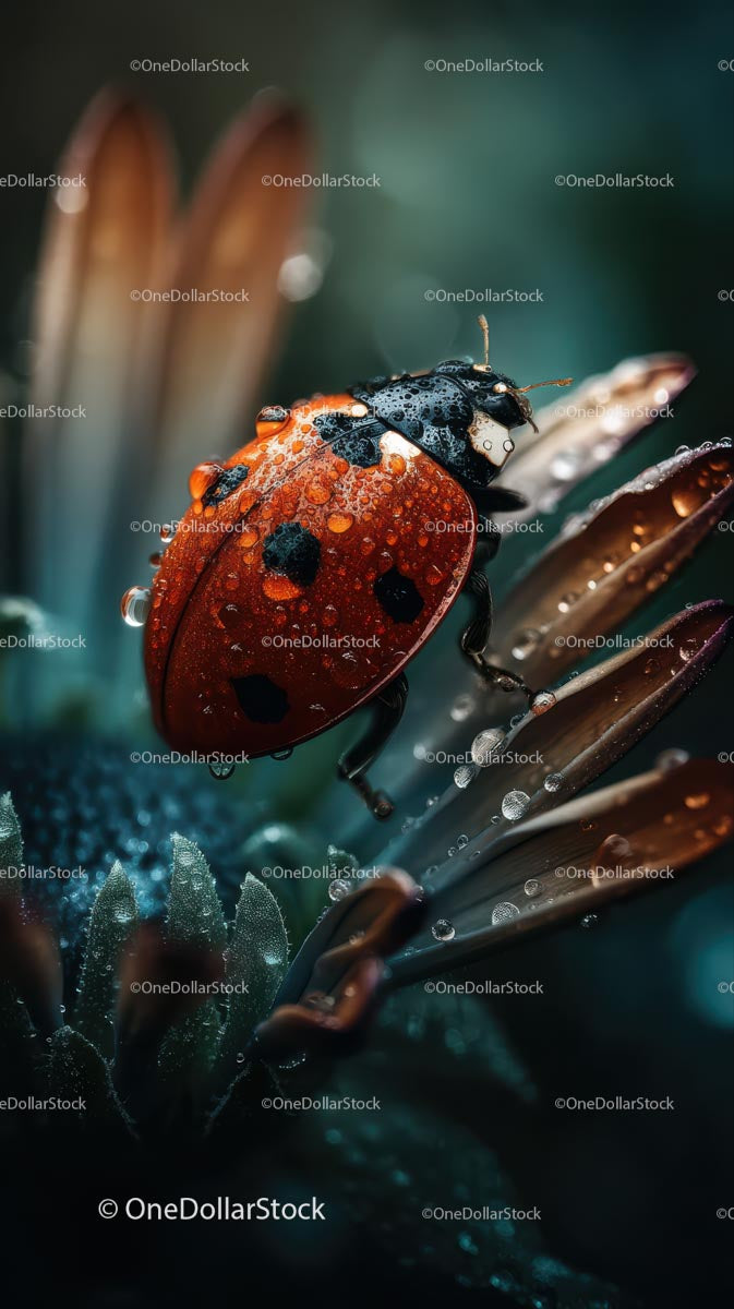 Ladybug with Dew Drops Resting on a Leaf