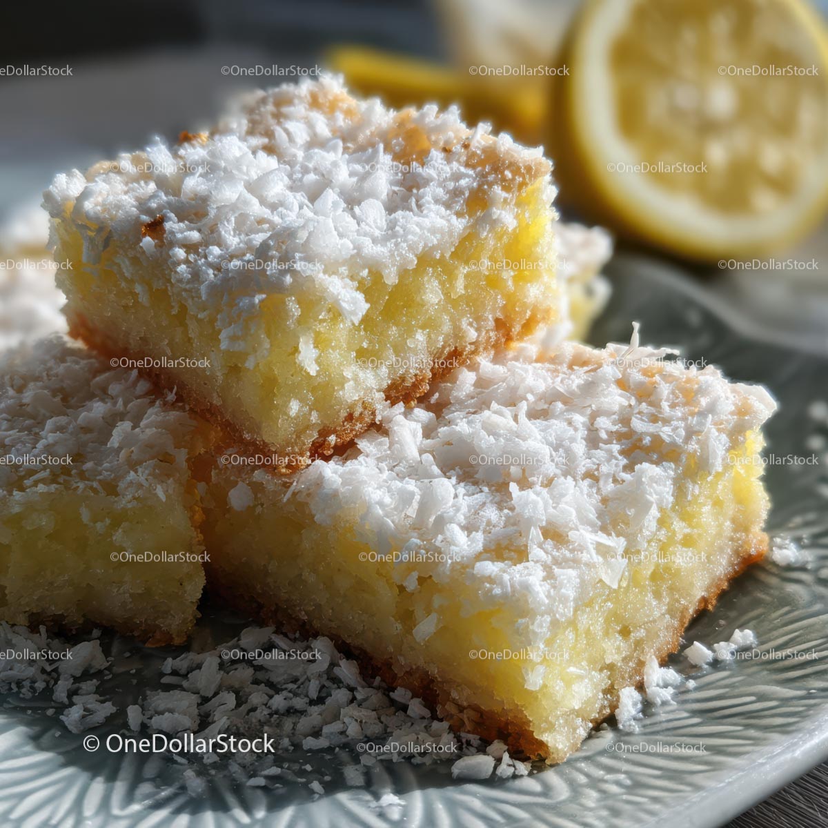 Lemon Bars with Coconut Topping on Rustic Plate