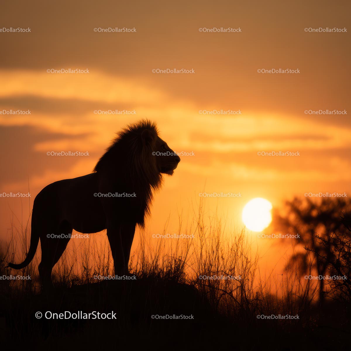 Lion Silhouette on African Savanna at Vibrant Sunset