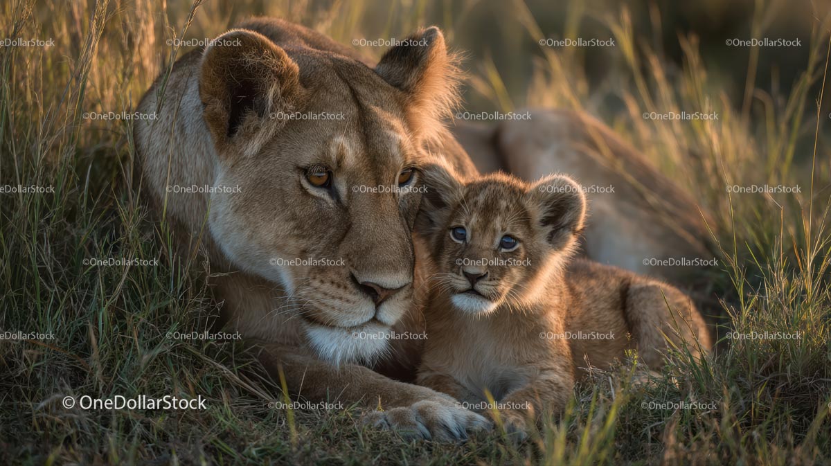 Lioness with Her Cub in African Savannah at Sunset