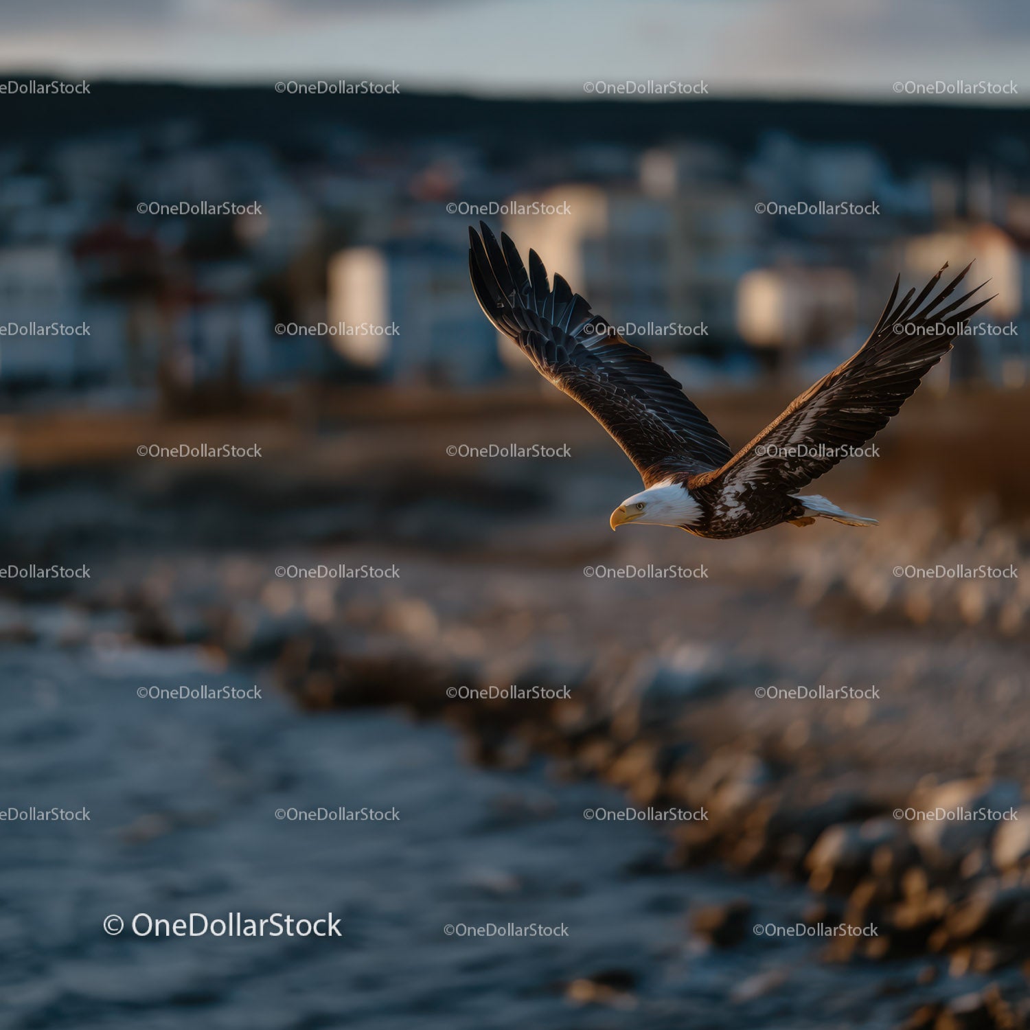 Majestic Bald Eagle in Flight Over Coastal Water and Rocks