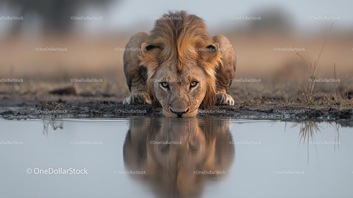 Majestic Lion Drinking at Waterhole in the African Savannah