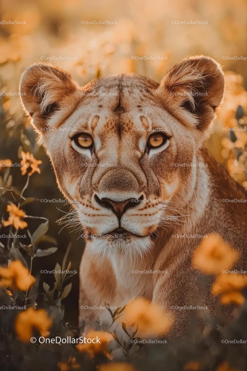 Majestic Lioness Amid Golden Savannah Blooms