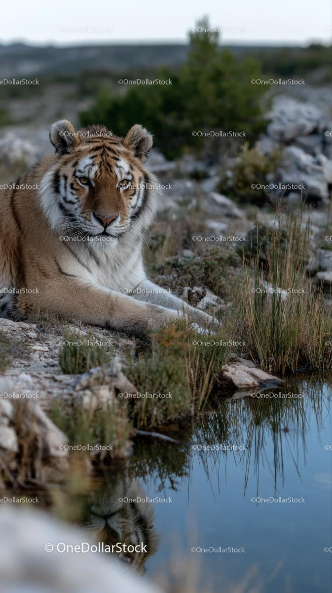 Majestic Tiger Resting by a Serene Pond in the Wilderness