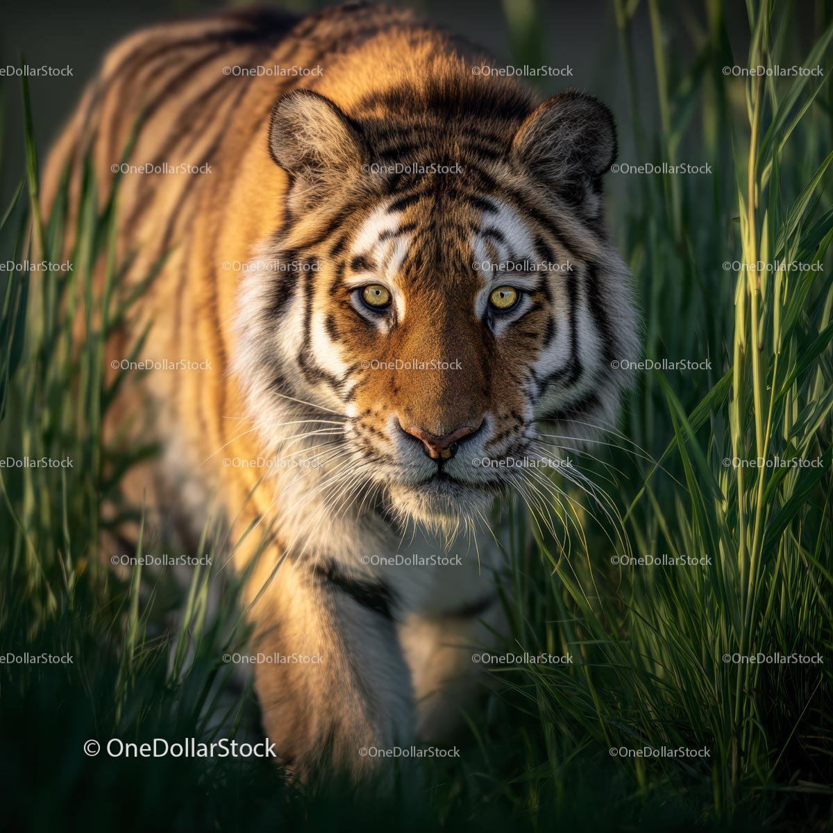 Majestic Tiger Stepping Through Lush Jungle Grass