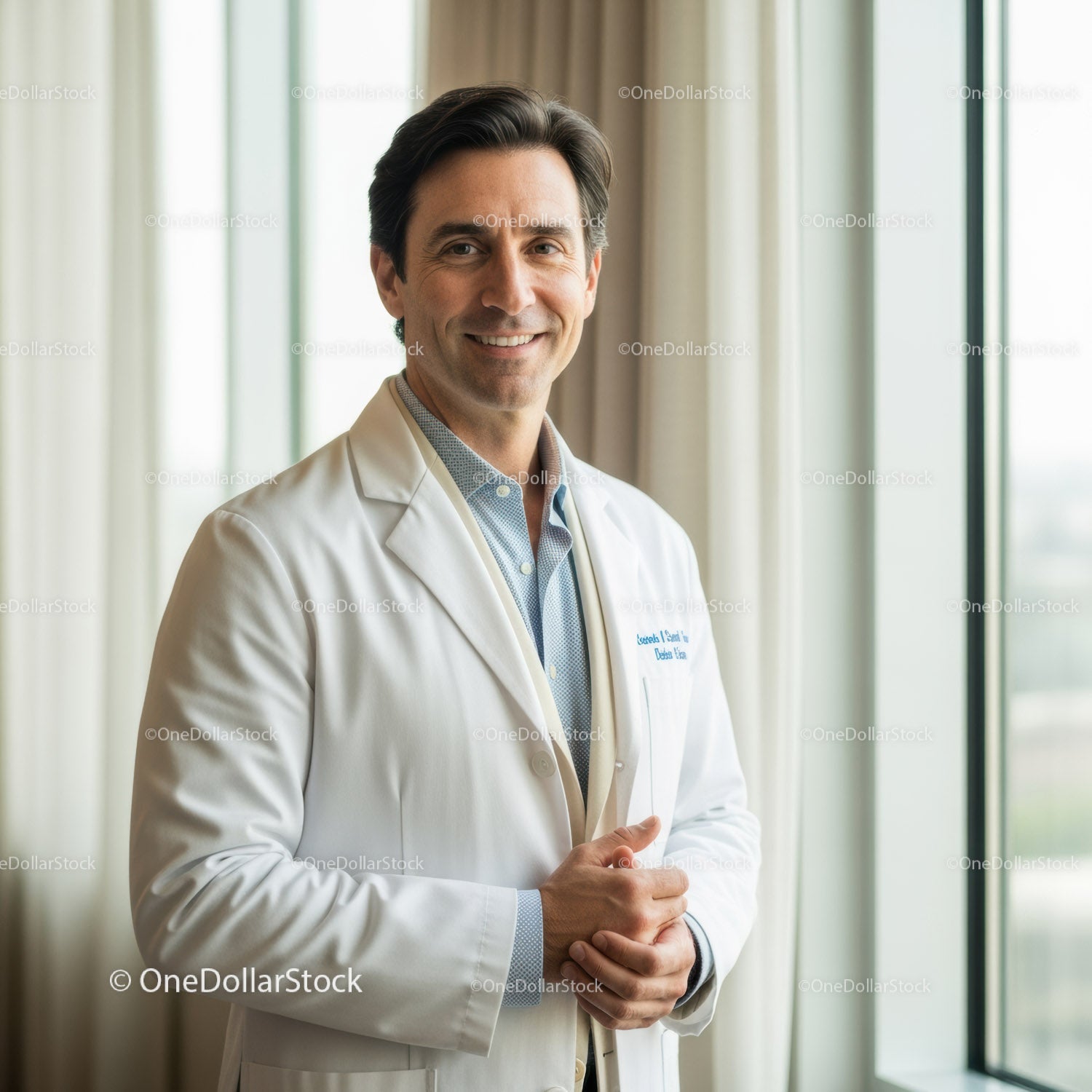 Male Doctor Smiling in Hospital Ward with Bright Natural Light